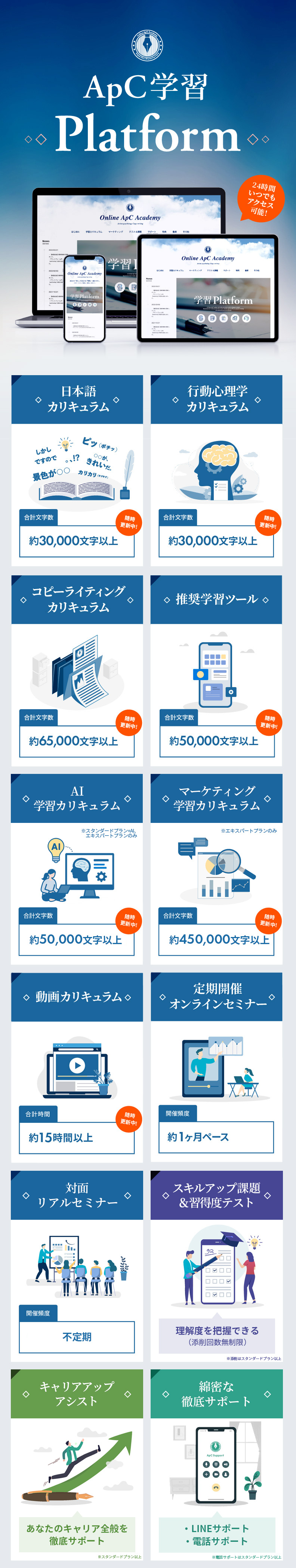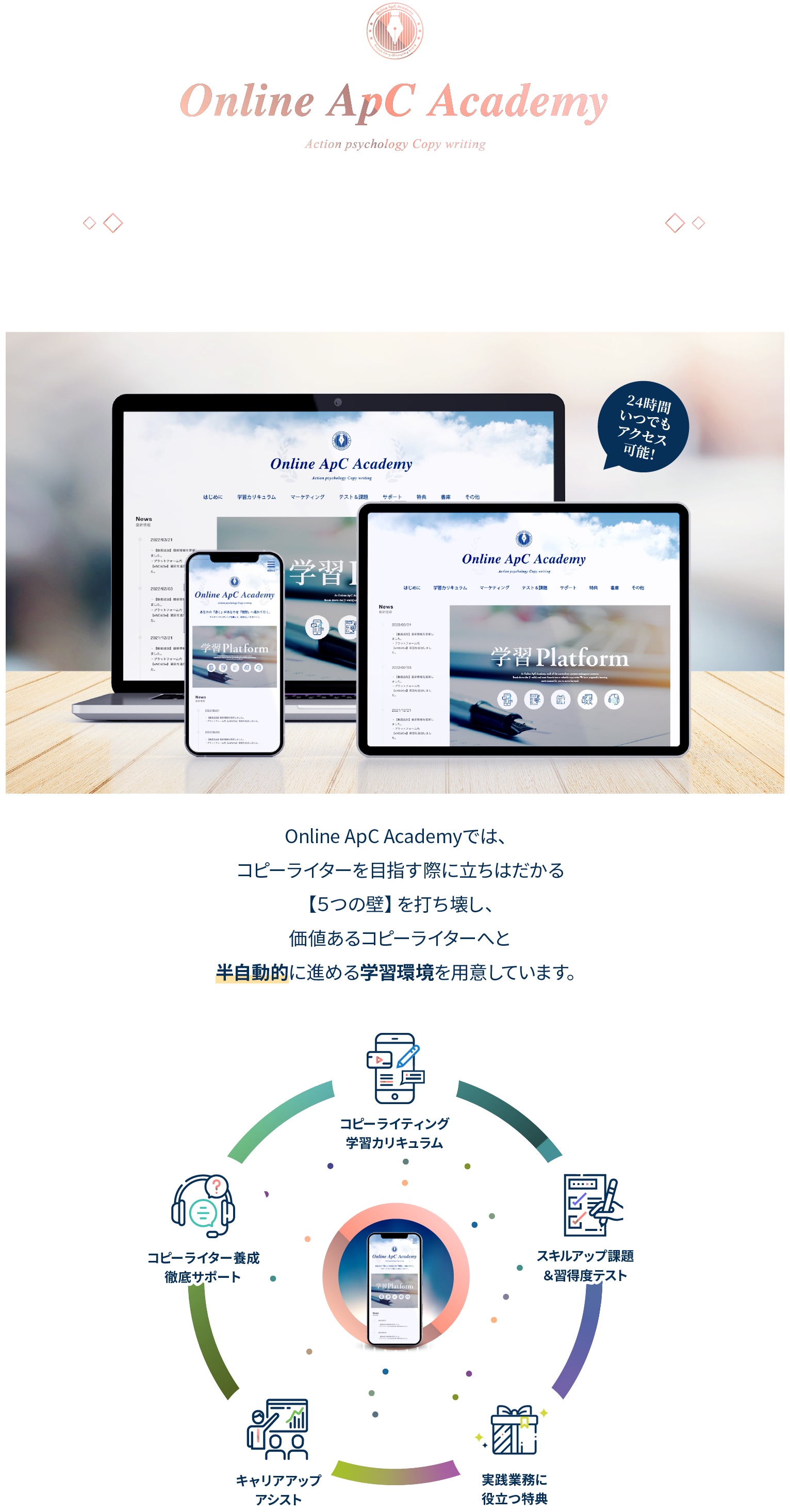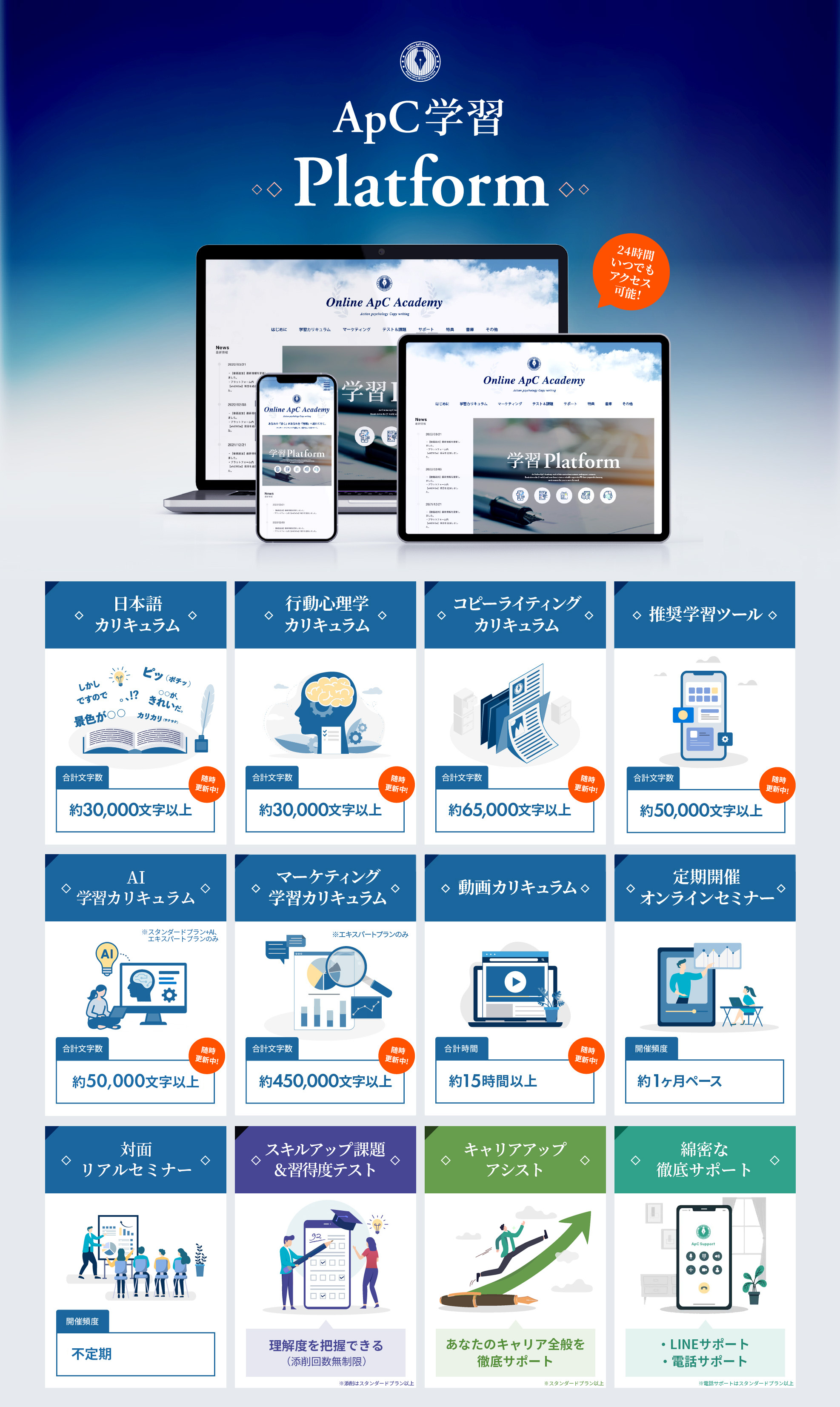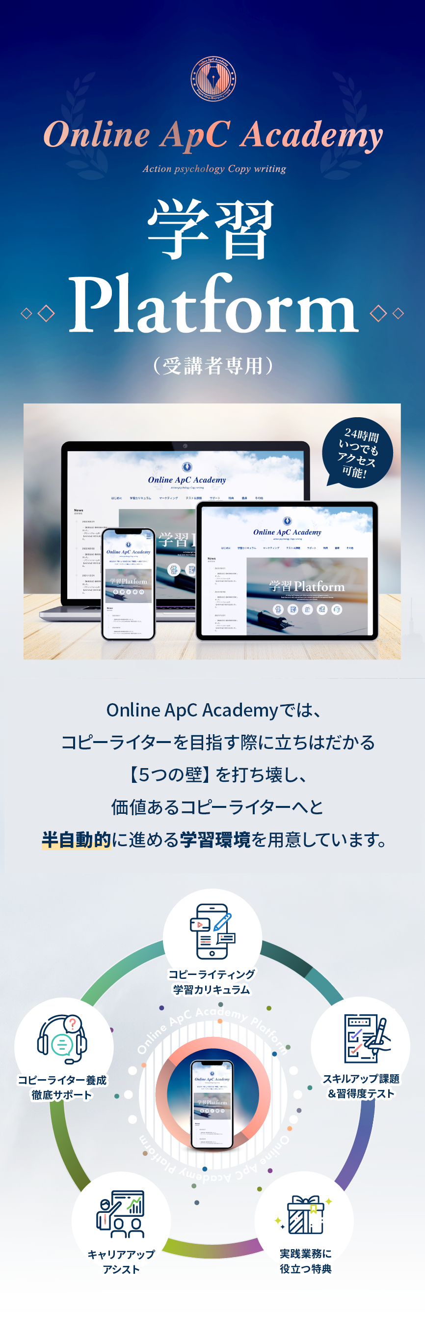 当社が提供する「Online ApC Academy」という名称のコピーライター養成オンラインスクール(理由の如何を問わず、その名称又は内容が変更された場合の当該変更後のサービスを含みます。)及び当社所定の関連ソフトウェアをいいます。