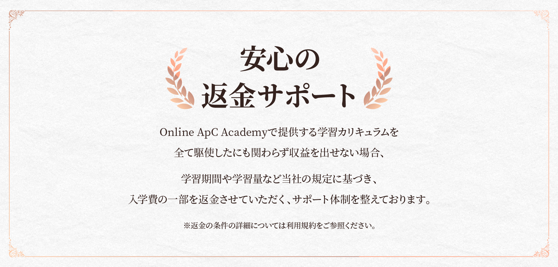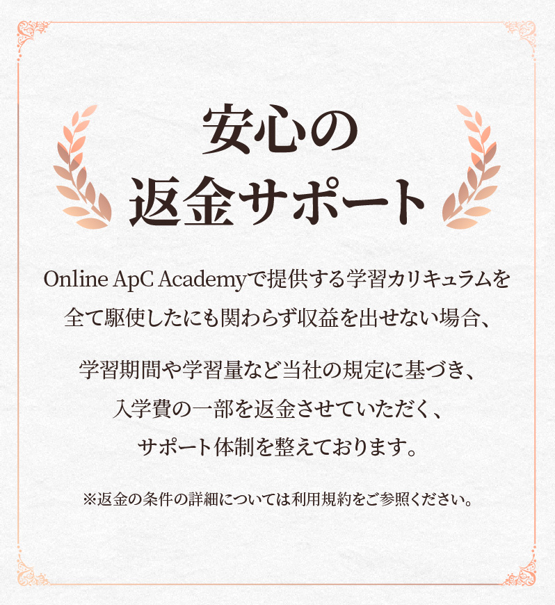 1.当アカデミーが提供する進行スケジュールに則り学習カリキュラムを駆使したのにも関わらず、一切の収益が得られなかった場合、当社の規定に則った料金を返金いたします。