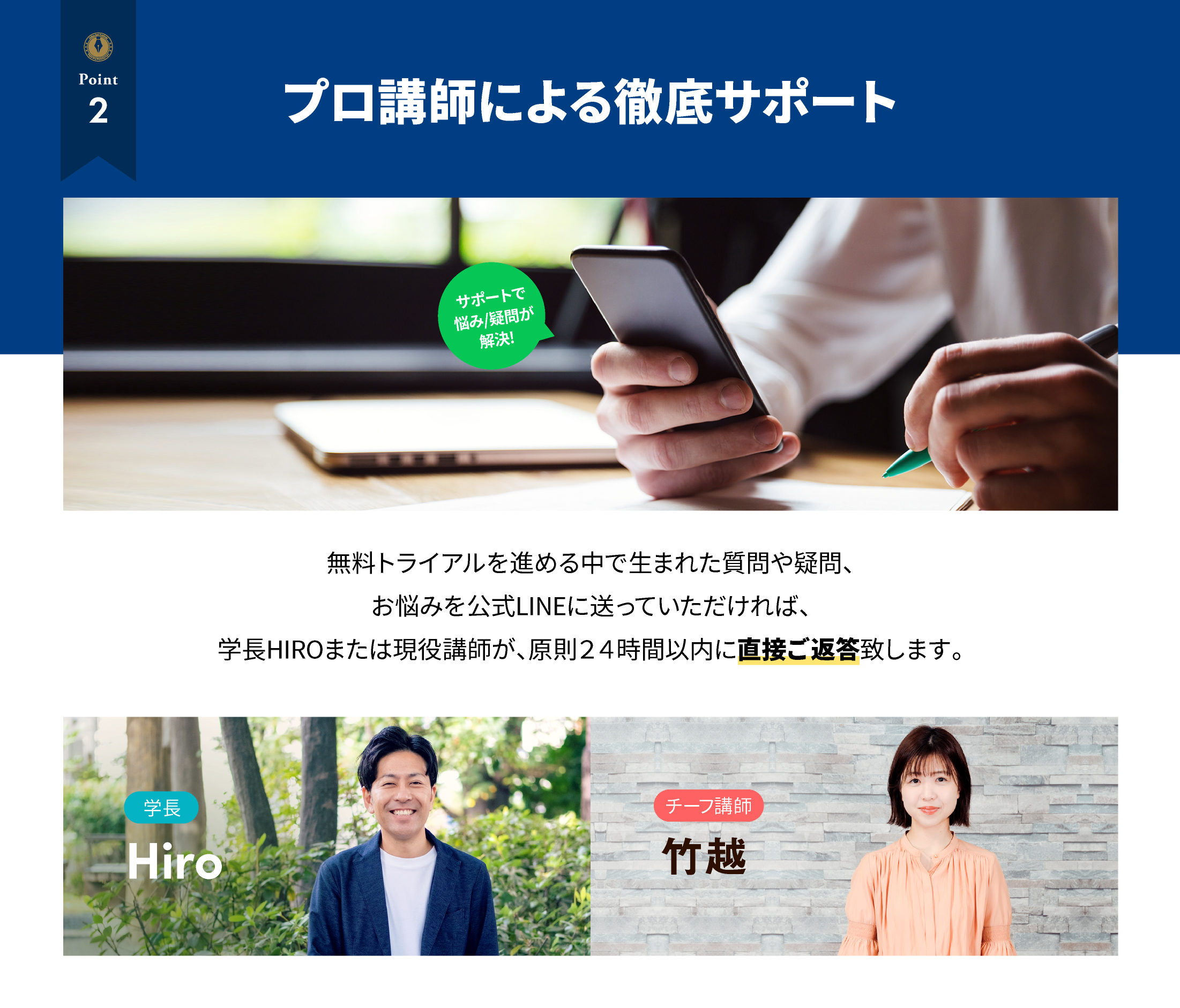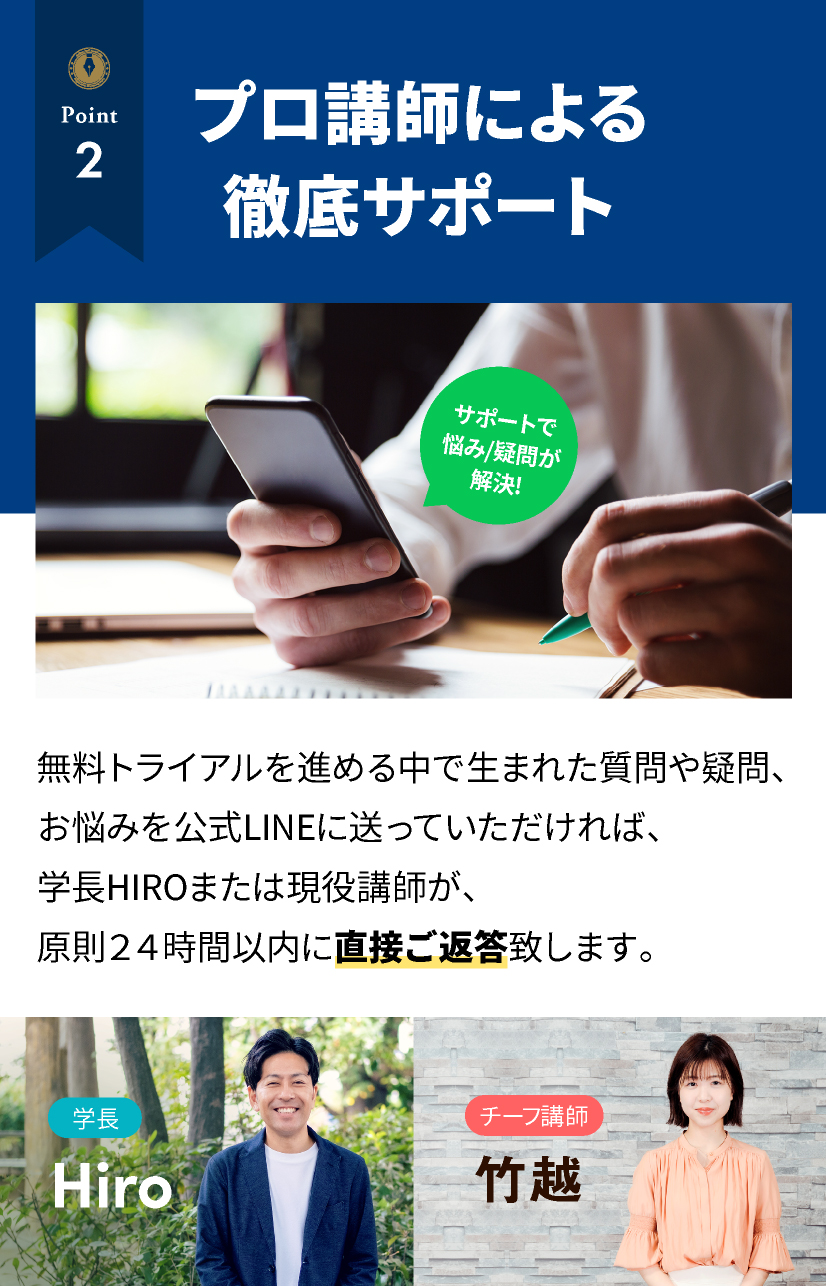 原則24時間以内に、学長HIROか講師がご対応させていただきますので、不安な点やご質問等はお気軽にご連絡ください。