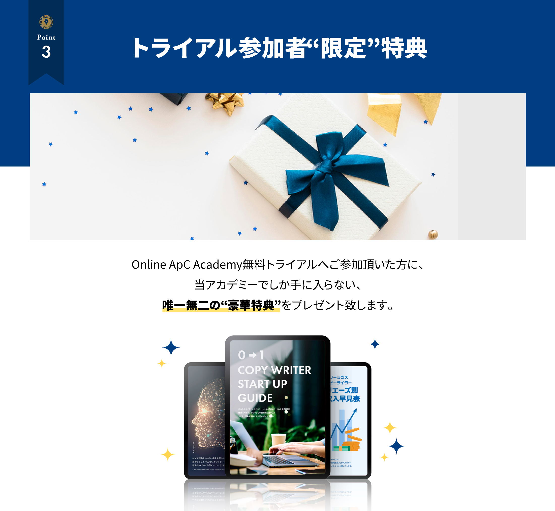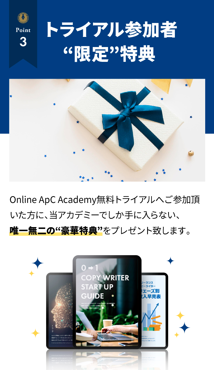 Online ApC Academy無料トライアルでは、講義動画・テキストブック・各種特典を中心に、“オンライン”で行います。