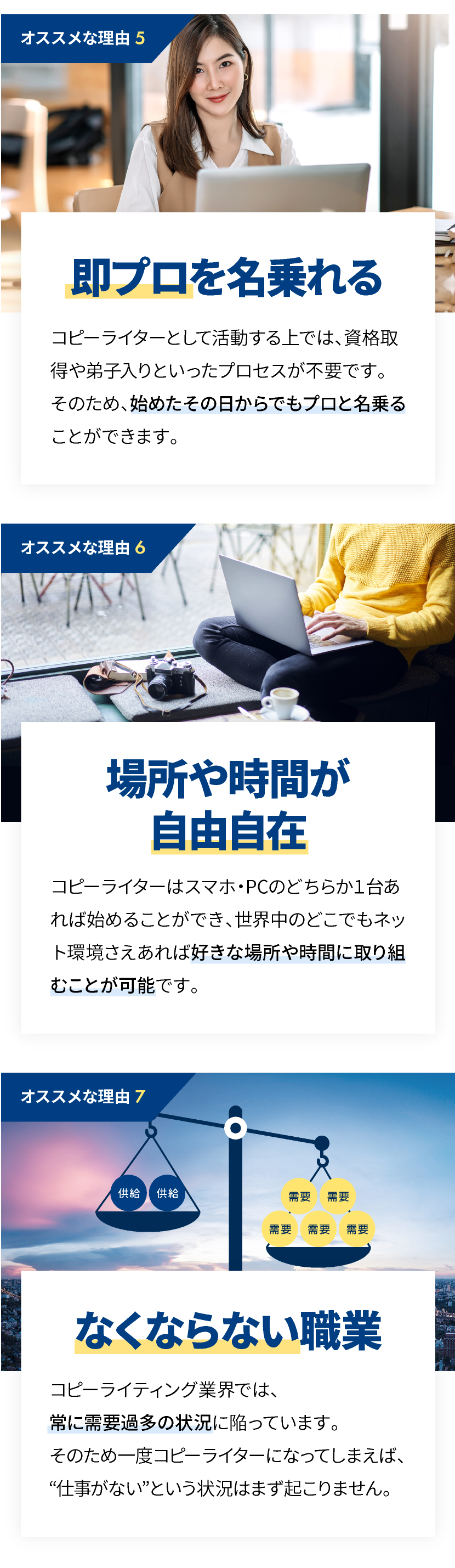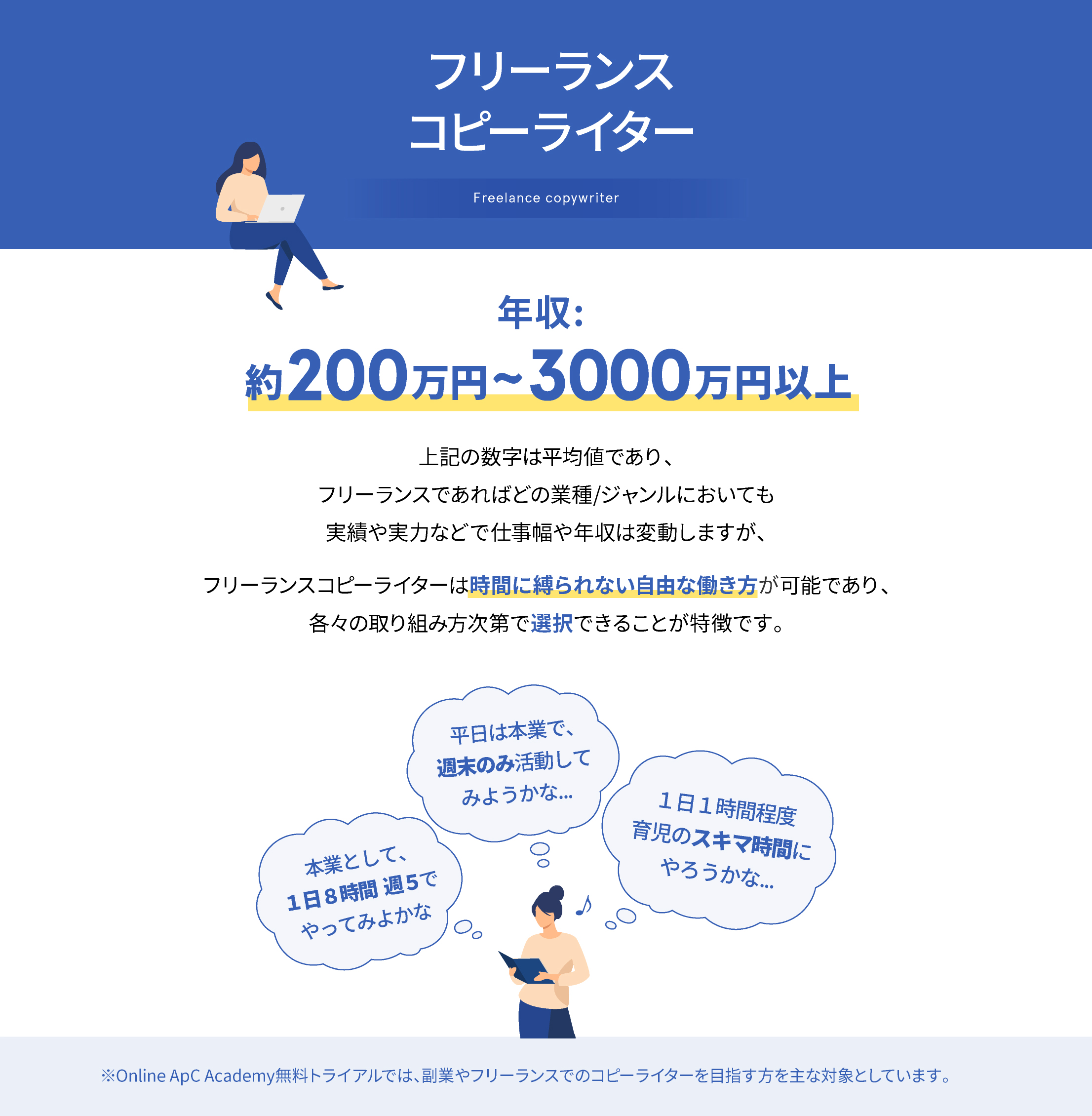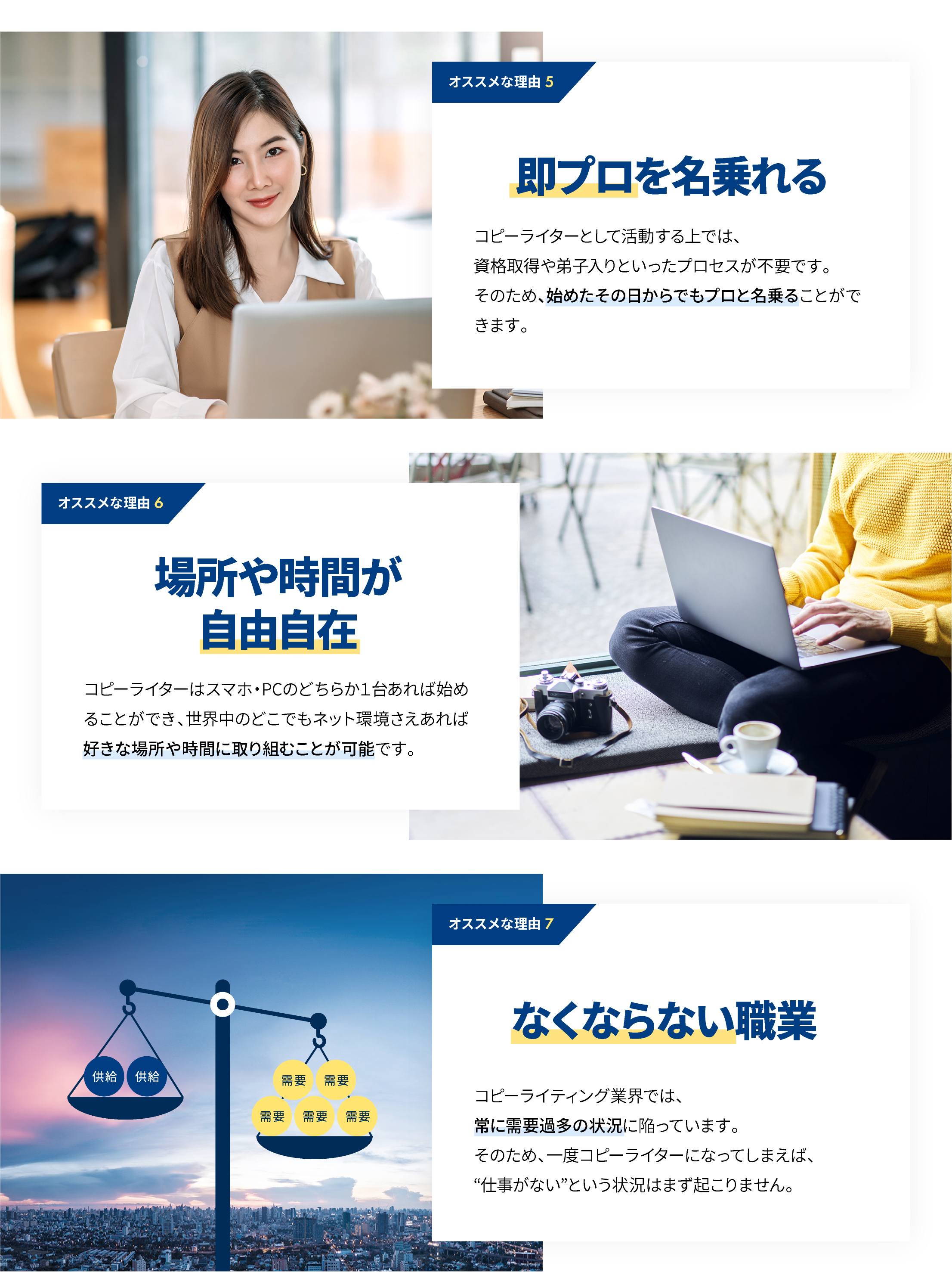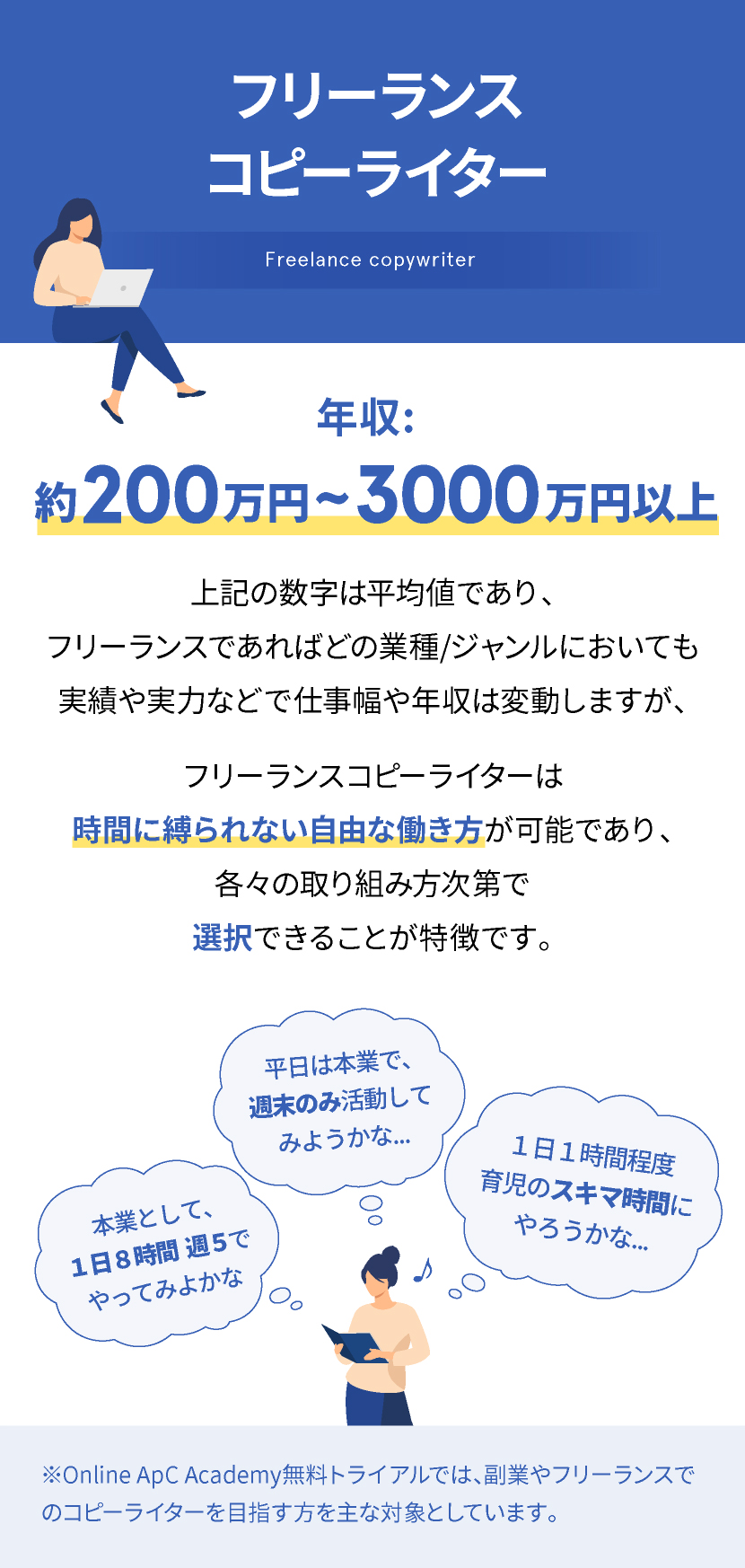 現在のお仕事と並行しながら取り組んだり、専業のフリーランスとして働くなど、それぞれにあった働き方が出来る点もコピーライターの大きな魅力の一つとなります。