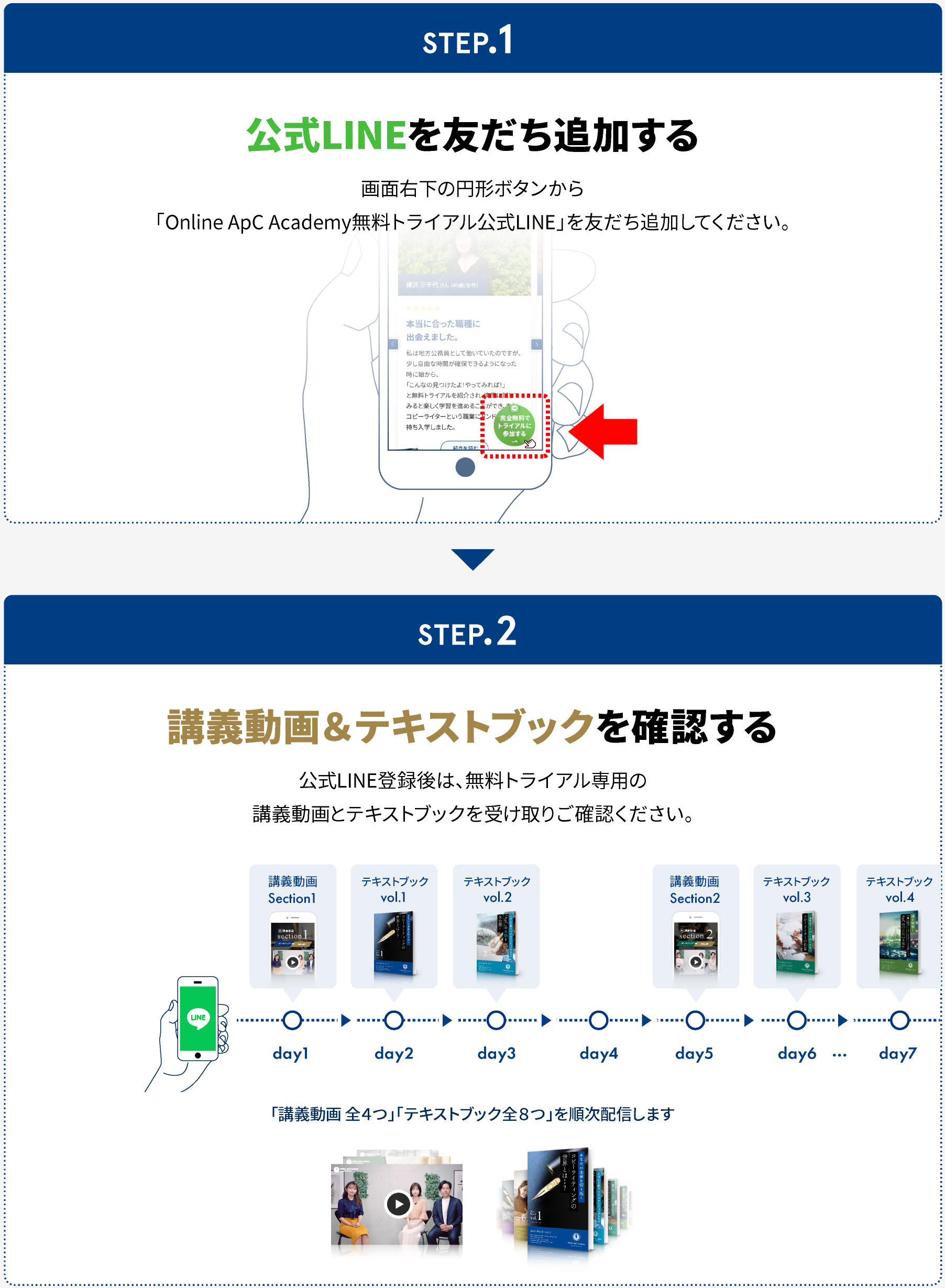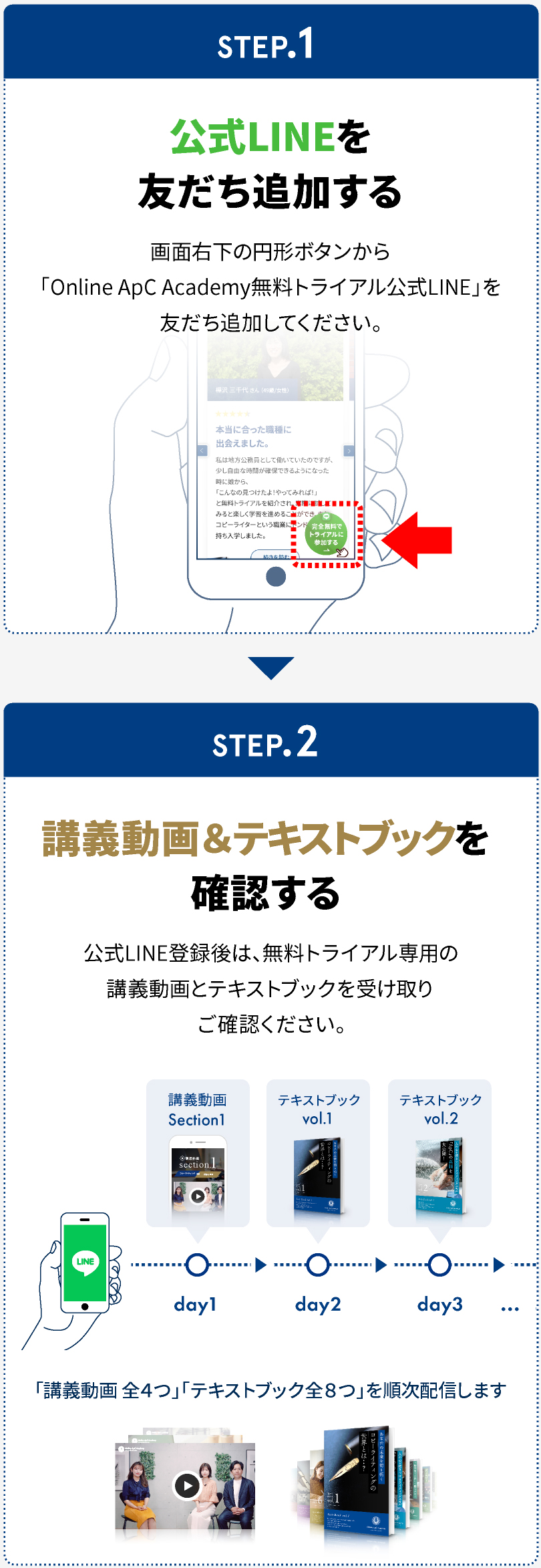 下部に設置してあるバナーを押して、Online ApC Academy無料トライアルの「公式LINE」にご登録いただくだけでご参加いただけます。