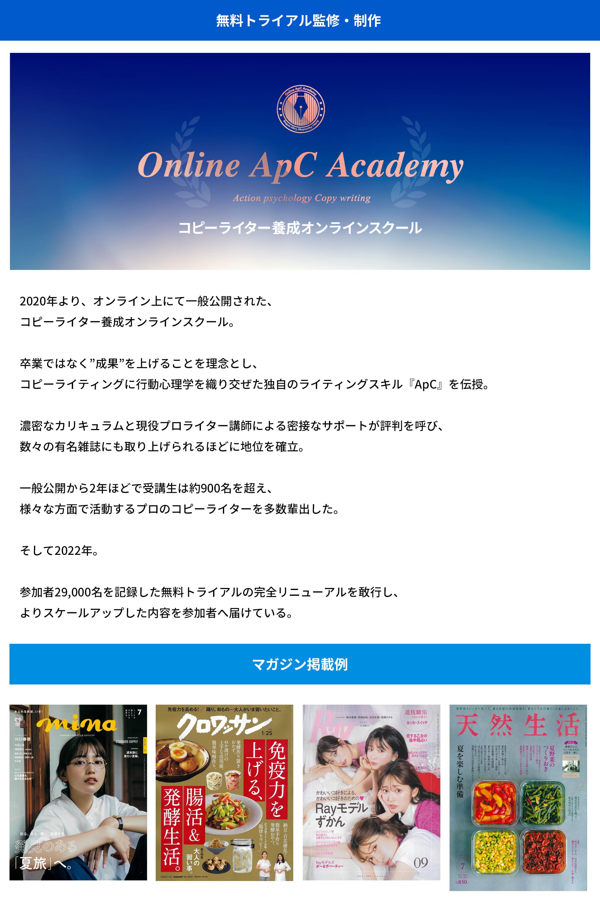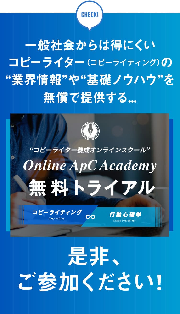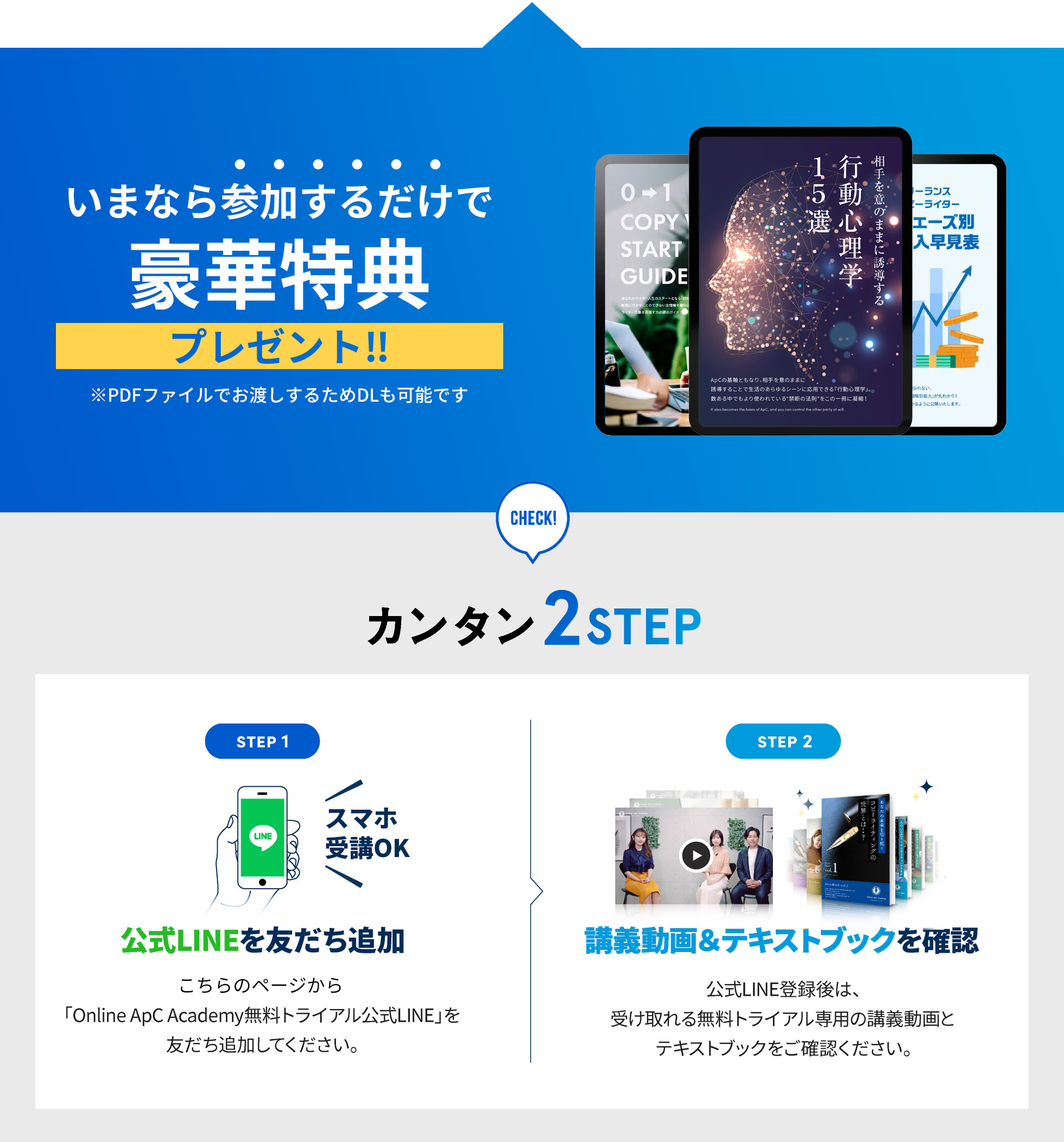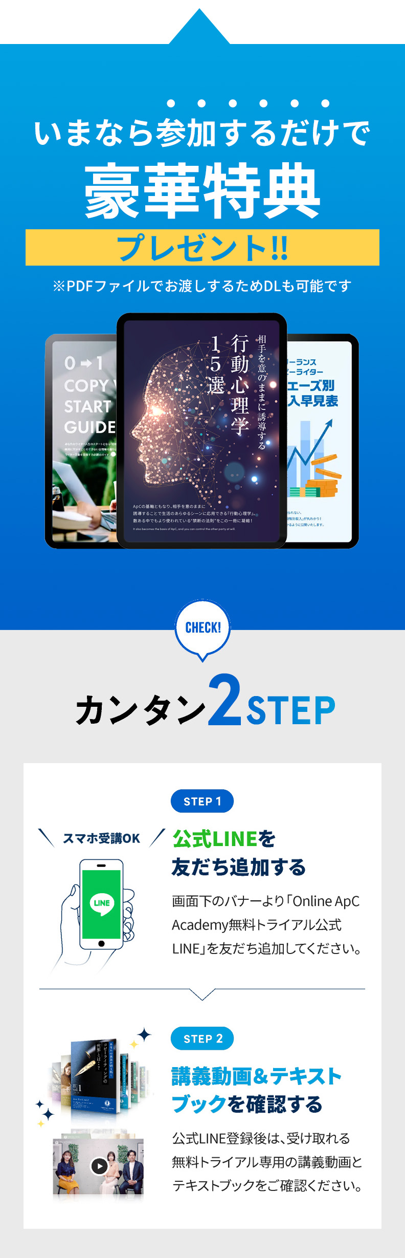 下記に設置しているボタンを押して、『Online ApC Academy無料トライアル公式LINE』にご登録いただくだけでご参加いただけます。